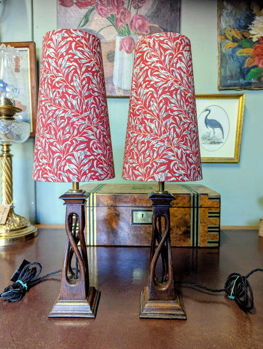 Pair of Arts & Crafts Wooden Table Lamps w/ Wm Morris Lampshades
