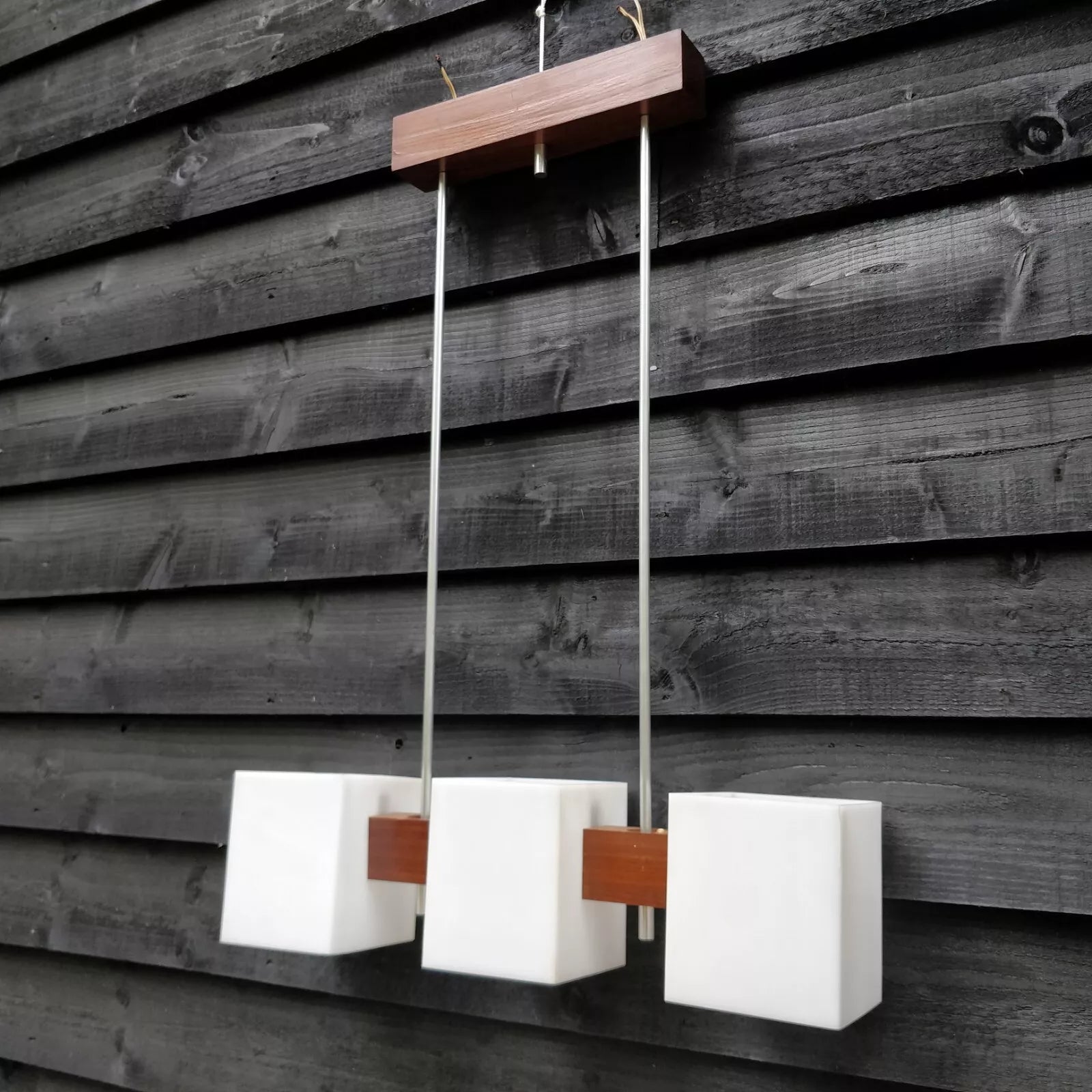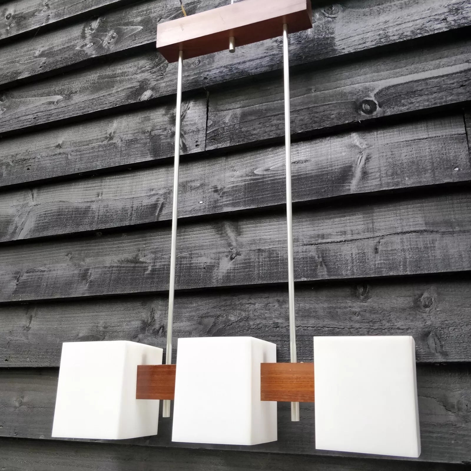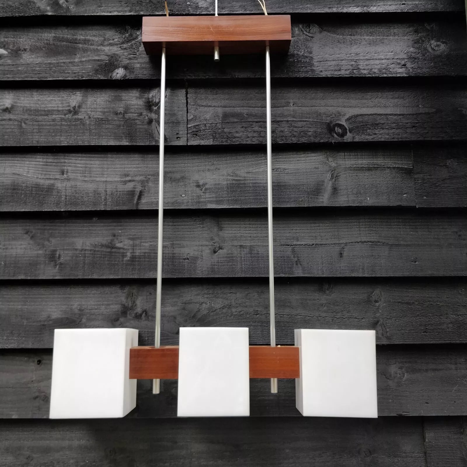 3 acrylic shades with veneered wood box spacers suspended from a further box by aluminium poles.